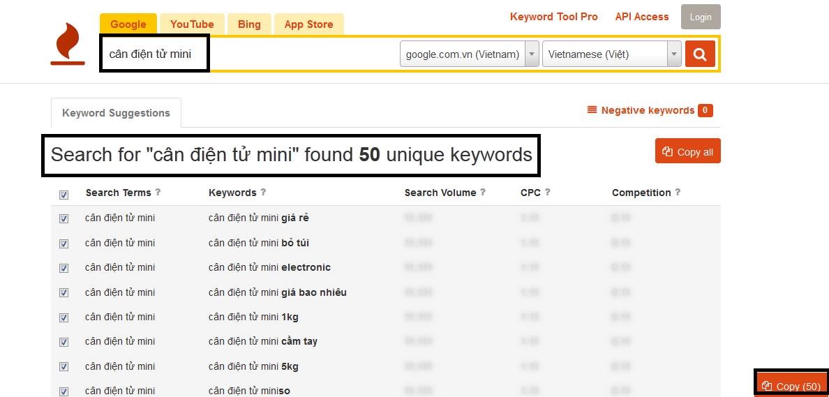 Đầu tiên bạn phải có từ khóa chính của lĩnh vực, mình lấy ví dụ bạn đang SEO lĩnh vực cân điện tử thì từ khóa chính nhất là từ: Cân Điện Tử . Từ đây bạn phải nghiên cứu về từ khóa, và các tiền tố - hậu tố từ khóa. Các bạn phải phân tích rất kỹ lưỡng về lĩnh vực này, sử dụng Google Suggest + Keywordtool.io để lọc ra tiền tố và hậu tố.